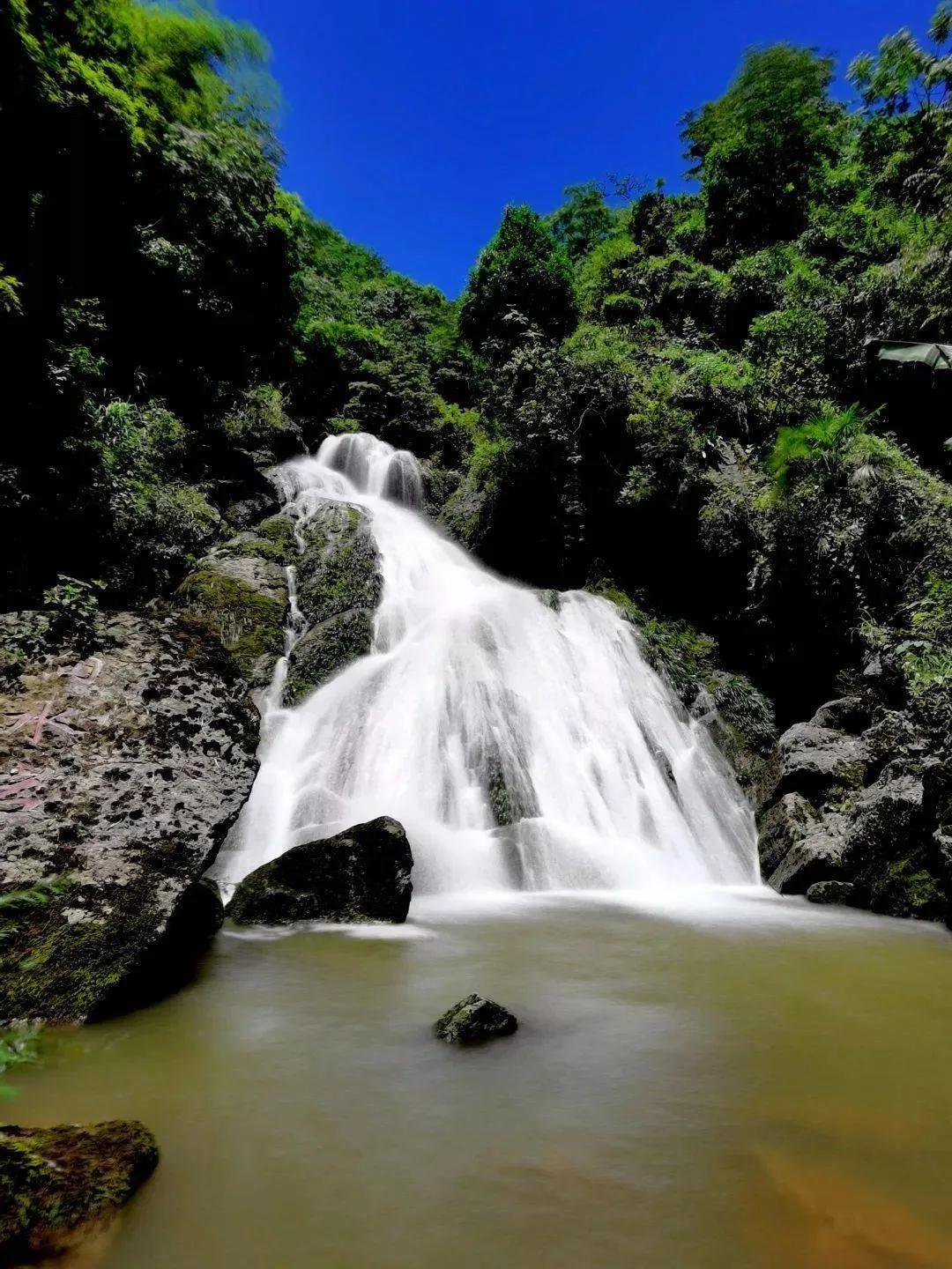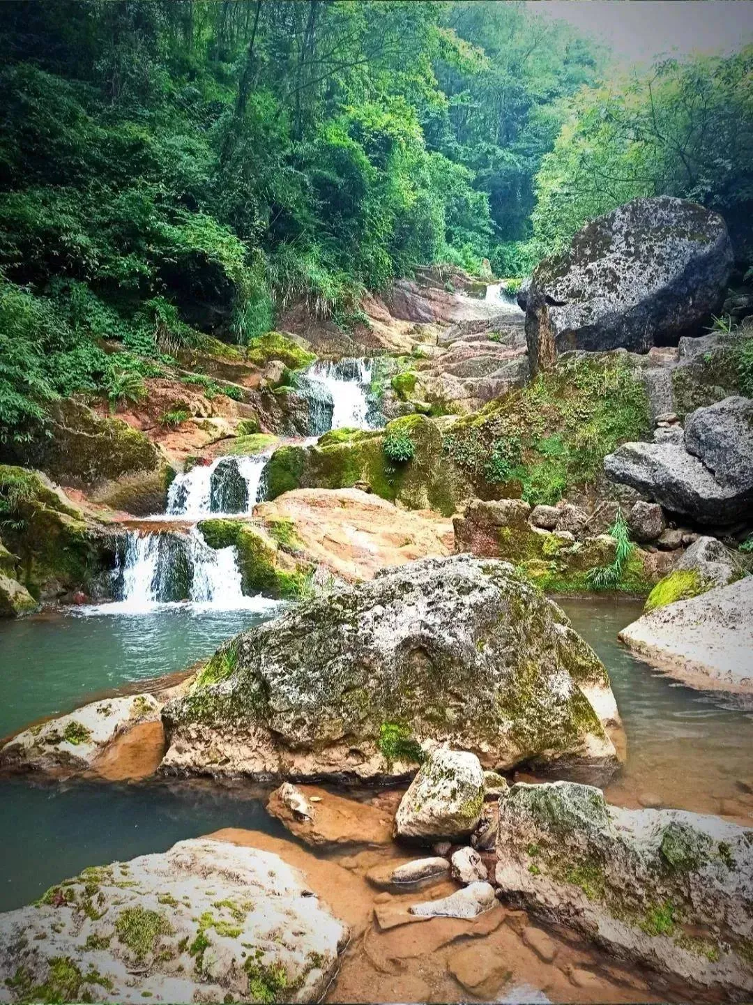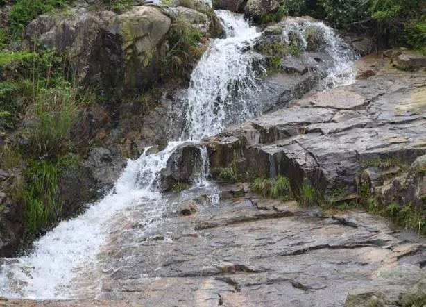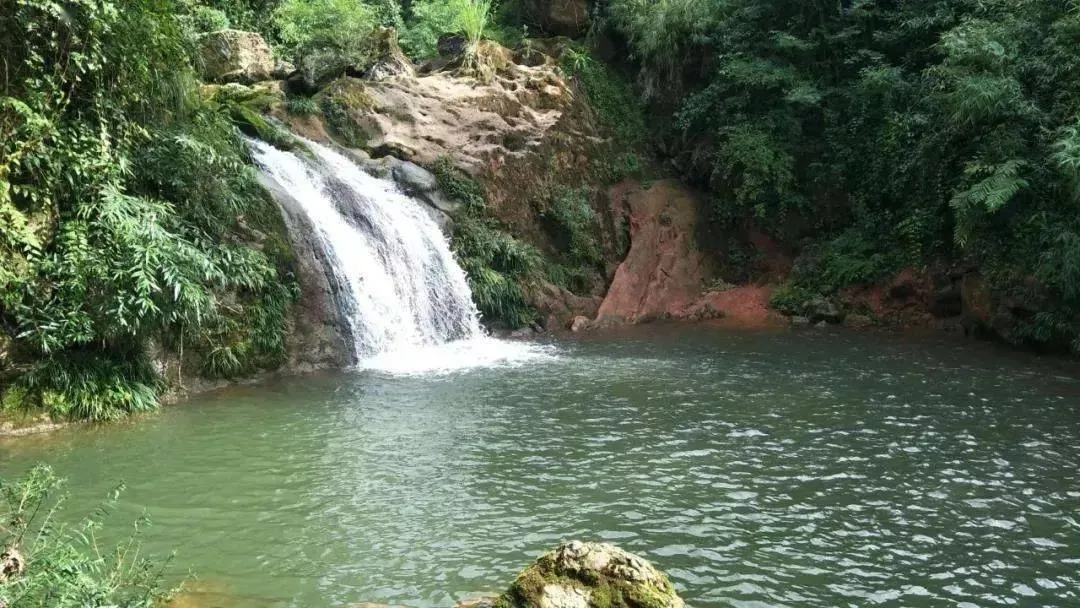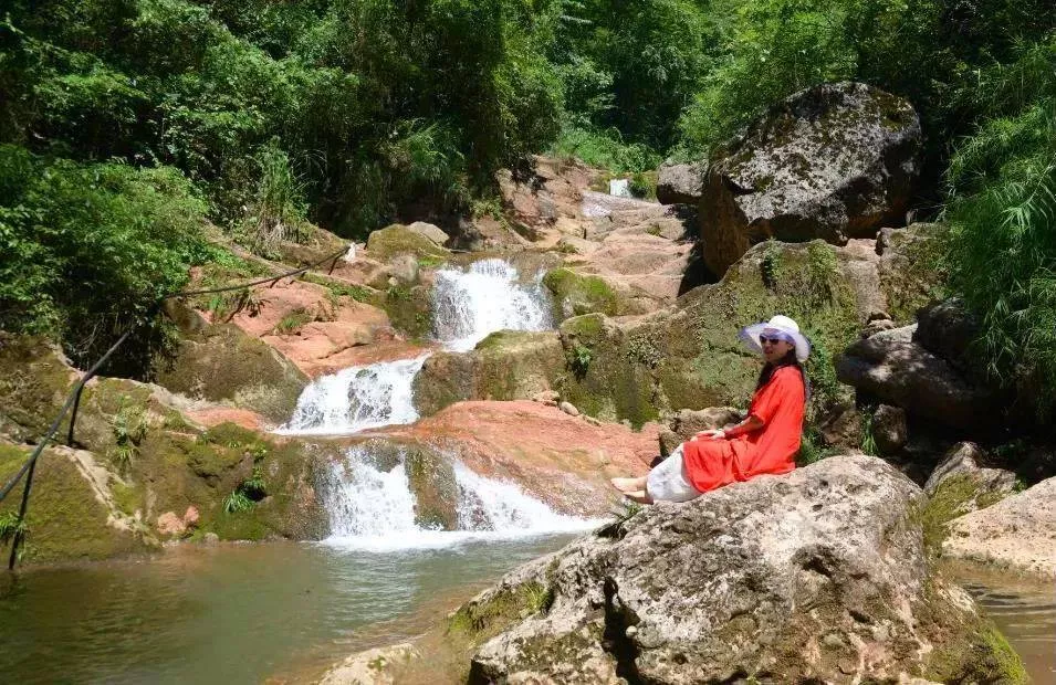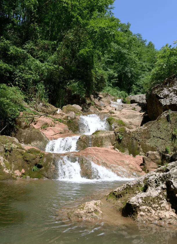 在群山掩映中,夬石河流經(jīng)此處形成了 9級疊潭、落差約80米的瀑布群,同時還形成了兩個偌大的水潭,更有野趣!