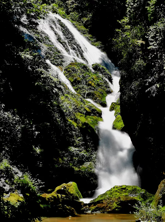 ▼彎弓崖瀑布,是這片瀑布群中離農(nóng)家山莊最近的一處,也是打卡人數(shù)較多的一處,此處森林覆蓋面積廣,山高谷深,瀑泉爭鳴,適合休閑納涼。