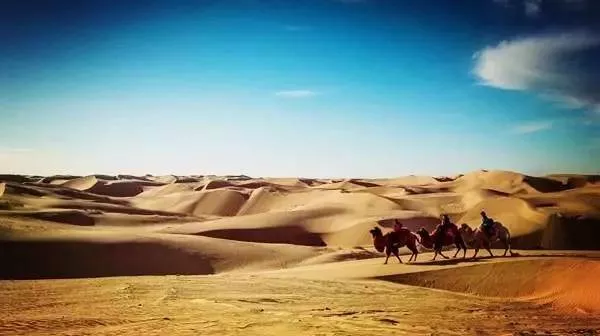 沙漠峰巒起伏,廣袤無垠,這片凝固的海,流動(dòng)的山,在朝暉夕陽中,變換著一條條蜿蜒的曲線,漸虛漸無,幻化出不同的大漠景象。落日、晚霞、大漠、孤煙,駝鈴悠揚(yáng),跟著駝隊(duì)走在沙漠上,天邊夕陽映上臉龐,聲聲駝鈴回蕩耳畔,可切身感受“長河落日,大漠駝鈴”的獨(dú)特魅力。晚上露宿沙漠,圍在篝火邊,載歌載舞,享受親近大自然帶來的無限樂趣。
