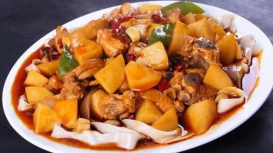 新疆大盤雞 新疆大盤雞又名沙灣大盤雞、辣子炒雞,是20世紀80年代起源于新疆公路邊飯館的江湖菜,主要用雞塊和土豆塊炒燉而成,還同新疆特色的馕、皮帶面搭配食用,其特點是:爽滑麻辣的雞肉和軟糯甜潤的土豆,辣中有香、粗中帶細,成為新疆最具代表的特色名菜。新疆大盤雞入選由中國烹飪協(xié)會主辦的“世界發(fā)布‘中國菜’活動暨全國省籍地域經典名菜”中新疆榜名單,被評為“中國菜”新疆十大經典名菜,還在第七屆烏魯木齊國際食品餐飲博覽會上被評為“新疆十大名菜”?!驹敿殹?br />中文名:新疆大盤雞外文名:The Xinjiang market chicken分類:新疆菜,西北菜口味:鮮、辣、麻主要食材:雞肉,土豆,辣椒,洋蔥,四川粉皮,皮帶面起源地:沙灣縣 贊 (0) 39 151 生成海報 海南白切文昌雞 下一篇 2008-08-08 酸辣禾花魚 上一篇 2008-08-08 相關推薦