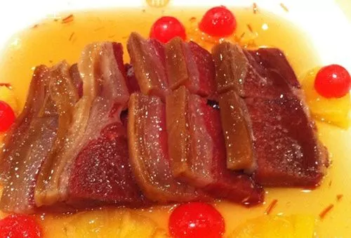 拔絲金腿 拔絲金腿是金華特色菜,也是金華的火腿名菜,屬于浙菜。以正宗金華火腿為原料制成甜菜的“拔絲金腿”,可謂別具一格。當(dāng)食客用筷子揀起一塊金黃發(fā)亮的拔絲小腿,立即拉出縷縷透明的糖絲,連綿不斷,咬開鮮脆的外皮,金腿的醇香撲鼻而來(lái),咸、甜、香、鮮集于一口,也是金華一道著名甜菜。 贊 (0) 39 151 生成海報(bào) 薄片火腿 下一篇 2008-08-08 火踵蹄膀 上一篇 2008-08-08 相關(guān)推薦