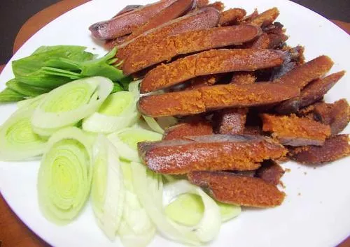 香烤烏魚子是臺(tái)灣年菜中必不可少一道菜,烏魚子是臺(tái)灣西部沿岸特產(chǎn),取烏魚卵腌制而成,捏成金磚般的塊狀,因此也被稱為“烏金”。此菜選用豐美堅(jiān)實(shí)、色如琥珀的烏魚子,以精湛的刀工切成精巧的薄片,在火上經(jīng)過(guò)微微炙烤,烤至雙面金黃時(shí)香氣四溢,入口鮮香有勁,輕微的黏牙感可以感受烏魚子細(xì)膩的質(zhì)感。配以甘甜微辣的白蘿卜、鮮辣的青蒜,最大程度地呈現(xiàn)烏魚子的原味,清涼可口,風(fēng)味絕佳。吃之前經(jīng)過(guò)烘烤,搭配白蘿卜片或青蒜片食用,是極為地道的一道臺(tái)灣傳統(tǒng)料理。在歐洲,這一美味也是老饕們鐘愛(ài)的餐桌上品。