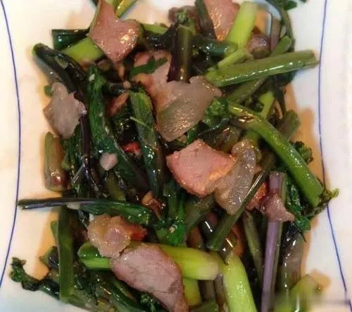 紅菜苔炒臘肉是湖北一道經(jīng)典名菜,屬于鄂菜,又叫臘肉炒菜苔,制作原料主要有臘肉、紅菜苔、蒜苗等,炒至辣椒香味溢出,再加入蒜苗翻炒至熟即可出鍋。紅菜苔是武漢地區(qū)的特產(chǎn),曾被封為“金殿玉菜”,武漢人都愛吃菜苔,清炒菜苔、菜苔炒臘肉都很好,而紅菜苔炒臘肉最為著名,廣為人知,名揚(yáng)四方。此菜特點(diǎn)是:新鮮的菜苔紫中帶紅,口感脆甜,切上幾片薄薄的臘肉,用小火煸出油,在晶瑩透明的臘肉襯托下,此菜色澤光鮮,味道鮮美。紅菜苔炒臘肉被湖北省政府評為“鄂菜十大名菜”,還被湖北省商務(wù)廳評選為“十大楚菜名菜”,更是被中國烹飪協(xié)會評為“