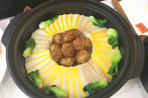 黃陂三鮮,又稱“黃陂三合”,是湖北武漢市黃陂區(qū)的漢族傳統(tǒng)名肴,屬于鄂菜系武漢菜,至今已有數(shù)百年歷史,在黃陂民間流傳著一句俗話“沒有三鮮不成席,三鮮不鮮不算好”,是湖北武漢傳統(tǒng)名菜。與北方的地三鮮不同,黃陂三鮮是魚丸、肉圓、肉糕這三鮮,三菜合燒,魚有肉味,肉有魚香,別有風(fēng)味,色香味美,清淡可口。三菜一碗,兩白一金,有黃花菜、木耳點(diǎn)綴其中,怎一個(gè)鮮字了得!黃陂三鮮也是一道宴席名菜,逢年過節(jié)在黃陂人的筵席上,一定能見到這道菜,是壓軸菜,具有吉祥喜慶的寓意,上世紀(jì)五六十年代,黃陂三鮮逐漸傳到武漢市區(qū),也漸漸成了武
